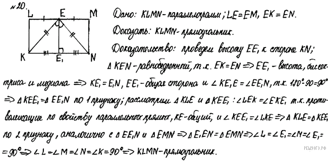 В параллелограмме KLMN точка Е — середина стороны LM. Известно, что EK = EN. Докажите, что данный параллелограмм — прямоугольник.