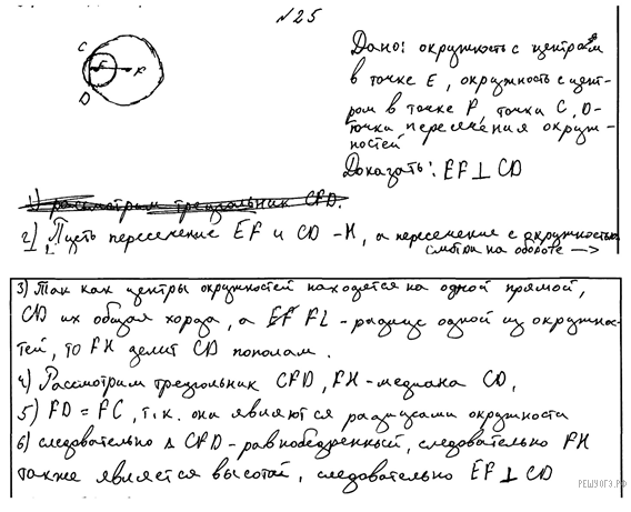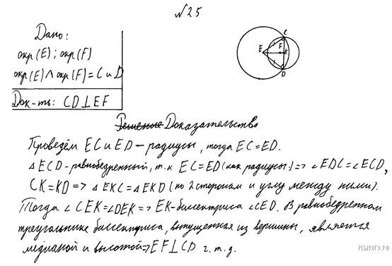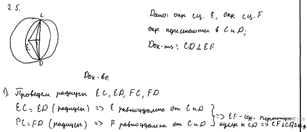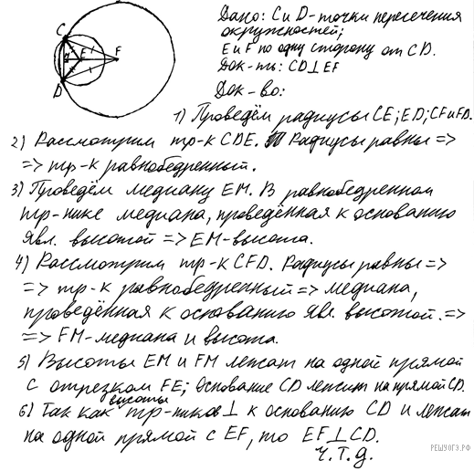 Две окружности с центрами E и F пересекаются в точках C и D, центры E и F лежат по одну сторону относительно прямой CD. Докажите, что прямая CD перпендикулярна прямой EF.