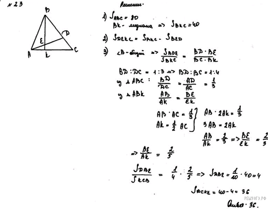 Площадь треугольника ABC равна 80. Биссектриса AD пересекает медиану BK в точке E, при этом BD : CD = 1 : 3. Найдите площадь четырехугольника EDCK.