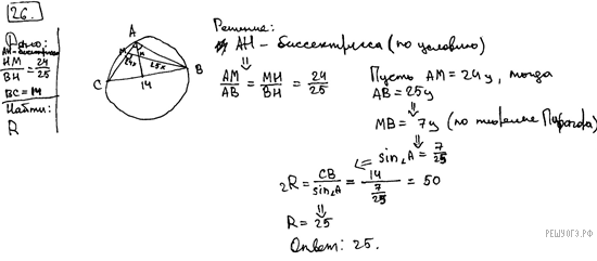 В треугольнике ABC биссектриса угла A делит высоту, проведенную из вершины B, в отношении 25 : 24, считая от точки B. Найдите радиус окружности, описанной около треугольника ABC, если