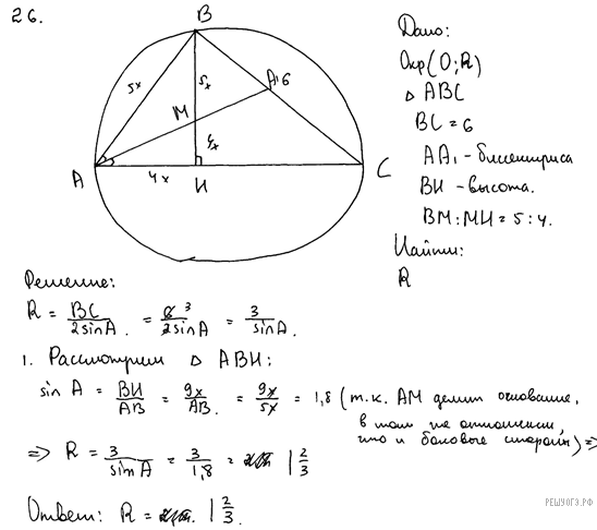 В треугольнике ABC биссектриса угла A делит высоту, проведенную из вершины B, в отношении 5 : 4, считая от точки B. Найдите радиус окружности, описанной около треугольника ABC, если