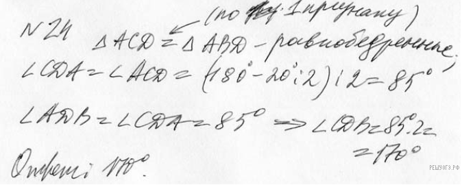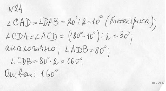 Угол BAC — центральный, следовательно, дуга BDC равна 20°, тогда большая (не содержащая точку D) дуга BC равна Угол BDC — вписанный, опирается на дугу 340°, тогда
