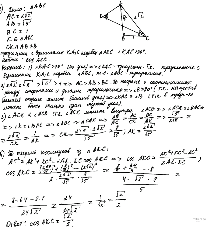 По условию то есть треугольник KAC — тупоугольный. Тогда подобный ему ABC также тупоугольный. Определим соответственные углы. Так как напротив большего угла лежит большая сторона, то