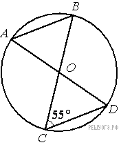 В окружности с центром в точке О проведены диаметры AD и BC, угол OCD равен 55°. Найдите величину угла OAB.