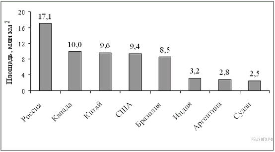 На диаграмме представлены некоторые из крупнейших по площади территории стран мира. Во сколько примерно раз площадь США больше площади Судана? (Ответ округлите до целых.)