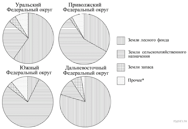 Версия для печати и копирования в MS WordНа диаграмме показано распределение земель Уральского, Приволжского, Южного и Дальневосточного Федеральных округов по категориям. Определите по диаграмме, в каком округе доля земель лесного фонда превышает 70%.