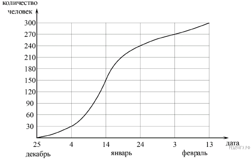 Версия для печати и копирования в MS WordНа графике показано, сколько человек зарегистрировалось с 25 декабря 2012 года по 13 февраля 2013 года в качестве участников конференции. По горизонтали указаны числа месяцев, а по вертикали — количество человек.