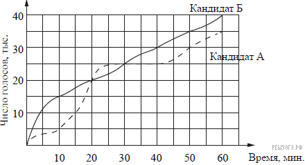 Версия для печати и копирования в MS WordНа графиках показано, как во время телевизионных дебатов между кандидатами А и Б телезрители голосовали за каждого из них. Сколько всего тысяч телезрителей проголосовало за первые 40 минут дебатов?