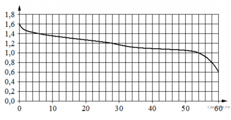 Версия для печати и копирования в MS WordПри работе фонарика батарейка постепенно разряжается и напряжение в электрической цепи фонарика падает. На графике показана зависимость напряжения в цепи от времени работы фонарика. На горизонтальной оси отмечено время работы фонарика в часах, на вертикальной оси — напряжение в вольтах. Определите по графику, за сколько часов работы фонарика напряжение упадет с 1 В до 0,6 В.