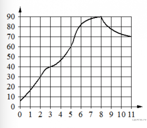 На графике показано изменение температуры в процессе разогрева двигателя легкового автомобиля. На горизонтальной оси отмечено время в минутах, прошедшее с момента запуска двигателя, на вертикальной оси - температура двигателя в градусах Цельсия. Определите по графику, на сколько градусов Цельсия нагреется двигатель с 5-й по 8-ю минуту с момента запуска.