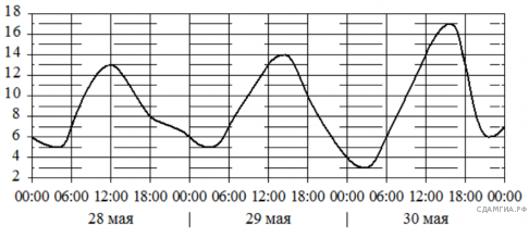 На графике показано изменение температуры воздуха на протяжении трех суток. По горизонтали указывается дата и время, по вертикали - значение температуры в градусах Цельсия. Определите по графику наименьшую температуру воздуха 30 мая. Ответ дайте в градусах Цельсия.