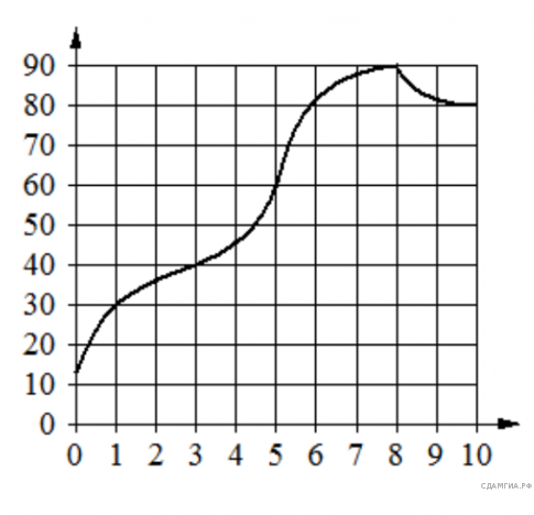 На графике показано изменение температуры в процессе разогрева двигателя легкового автомобиля. На горизонтальной оси отмечено время в минутах, прошедшее с момента запуска двигателя, на вертикальной оси - температура двигателя в градусах Цельсия. Определите по графику, за сколько минут двигатель нагреется с 30 °C до 40 °C.