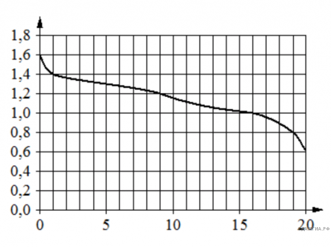 При работе фонарика батарейка постепенно разряжается и напряжение в электрической цепи фонарика падает. На графике показана зависимость напряжения в цепи от времени работы фонарика. На горизонтальной оси отмечено время работы фонарика в часах, на вертикальной оси - напряжение в вольтах. Определите по графику, на сколько вольт упадет напряжение с 1-го по 9-й час работы фонарика.