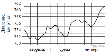 Версия для печати и копирования в MS WordНа рисунке изображен график изменения атмосферного давления в городе Энске за три дня. По горизонтали указаны дни недели, по вертикали — значения атмосферного давления в миллиметрах ртутного столба. Укажите наибольшее значение атмосферного давления во вторник.
