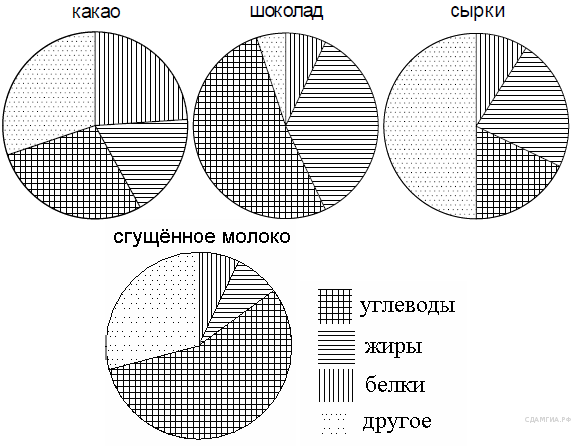 На диаграмме показано содержание питательных веществ в четырех видах продуктов. Определите по диаграмме, в каких продуктах содержание углеводов превышает 50%.