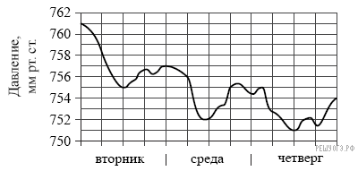 На рисунке изображен график изменения атмосферного давления в городе Энске за три дня. По горизонтали указаны дни недели, по вертикали — значения атмосферного давления в миллиметрах ртутного столба. Укажите наименьшее значение атмосферного давления в среду.