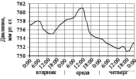 На рисунке изображен график изменения атмосферного давления в городе Энске за три дня. По горизонтали указаны дни недели и время, по вертикали значения атмосферного давления в миллиметрах ртутного столба. Укажите значение атмосферного давления (в мм рт. ст.) в среду в 6 часов утра.