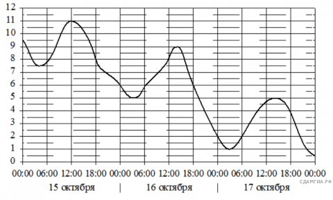 На рисунке показано, как изменялась температура воздуха на протяжении одних суток. По горизонтали указано время суток, по вертикали - значение температуры в градусах Цельсия. Сколько часов в первой половине суток температура не превышала 9 °C?
