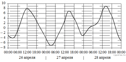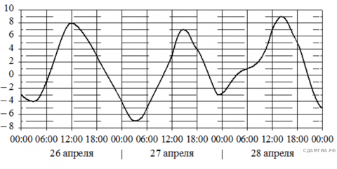 На графике показано изменение температуры воздуха на протяжении трех суток. По горизонтали указывается дата и время, по вертикали - значение температуры в градусах Цельсия. Определите по графику наименьшую температуру воздуха 26 апреля. Ответ дайте в градусах Цельсия.