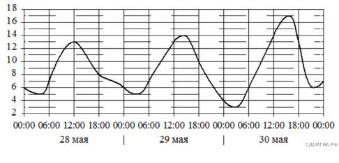 На графике показано изменение температуры воздуха на протяжении трех суток. По горизонтали указывается дата и время, по вертикали — значение температуры в градусах Цельсия. Определите по графику наименьшую температуру воздуха 28 мая. Ответ дайте в градусах Цельсия.