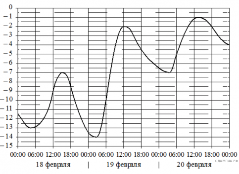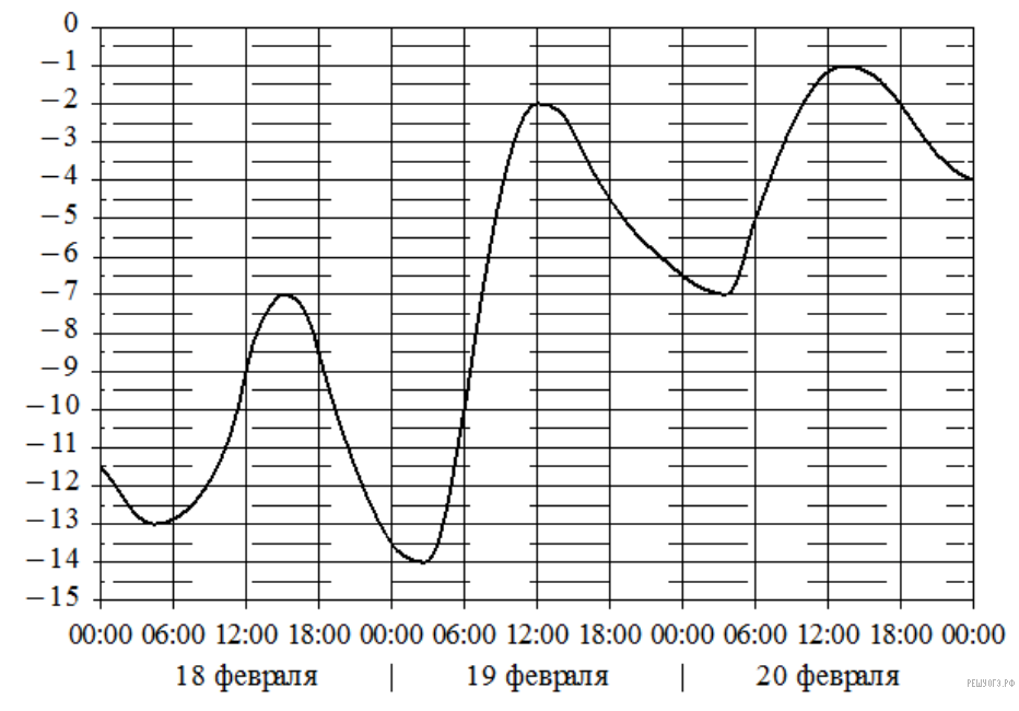 На графике показано изменение температуры воздуха на протяжении трех суток. По горизонтали указывается дата и время, по вертикали значение температуры в градусах Цельсия. Определите по графику наименьшую температуру воздуха 19 февраля. Ответ дайте в градусах Цельсия.