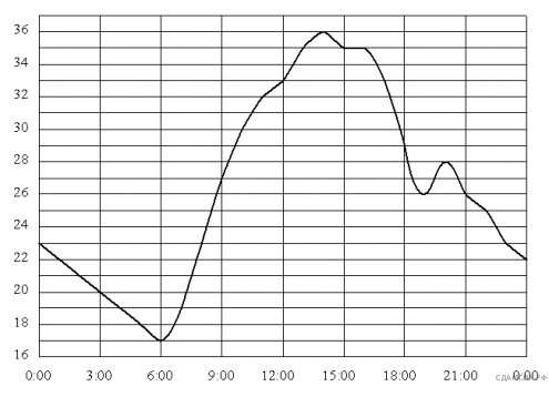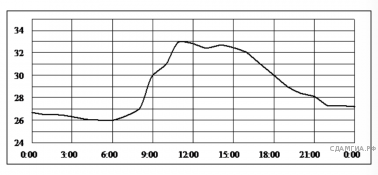 На рисунке показано, как изменялась температура воздуха на протяжении одних суток. По горизонтали указано время суток, по вертикали - значение температуры в градусах Цельсия. Сколько часов температура не превышала 30 °C?