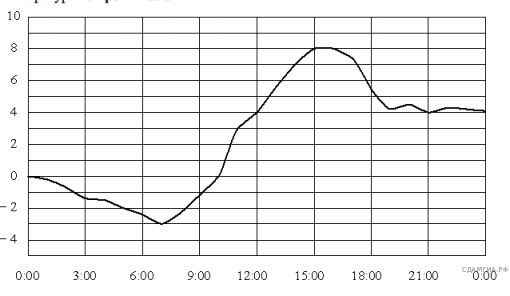 На рисунке показано, как изменялась температура воздуха на протяжении одних суток. По горизонтали указано время суток, по вертикали - значение температуры в градусах Цельсия. Сколько часов в первой половине суток температура не превышала 4 °C?