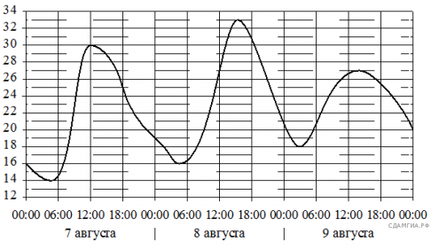 На графике показано изменение температуры воздуха на протяжении трех суток. По горизонтали указывается дата и время, по вертикали — значение температуры в градусах Цельсия. Определите по графику наибольшую температуру воздуха 7 августа. Ответ дайте в градусах Цельсия.