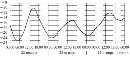 На графике показано изменение температуры воздуха на протяжении трех суток. По горизонтали указывается дата и время, по вертикали значение температуры в градусах Цельсия. Определите по графику наименьшую температуру воздуха 22 января. Ответ дайте в градусах Цельсия.