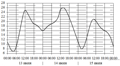 На графике показано изменение температуры воздуха на протяжении трех суток. По горизонтали указывается дата и время, по вертикали — значение температуры в градусах Цельсия. Определите по графику наибольшую температуру воздуха 13 июля. Ответ дайте в градусах Цельсия.