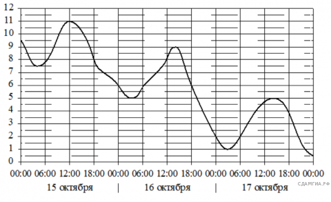 На графике показано изменение температуры воздуха на протяжении трех суток. По горизонтали указывается дата и время, по вертикали - значение температуры в градусах Цельсия. Определите по графику наибольшую температуру воздуха 17 октября. Ответ дайте в градусах Цельсия.