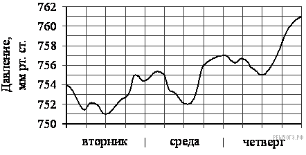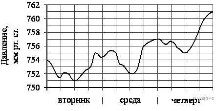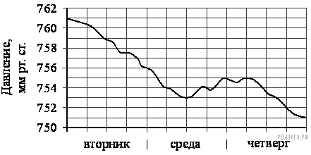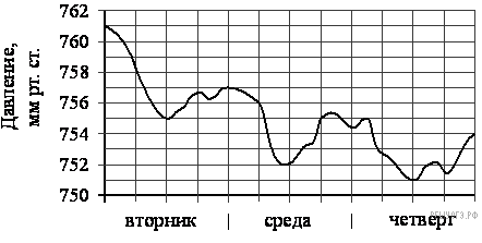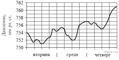 На рисунке изображен график изменения атмосферного давления в городе Энске за три дня. По горизонтали указаны дни недели, по вертикали — значения атмосферного давления в миллиметрах ртутного столба. Укажите наименьшее значение атмосферного давления во вторник.
