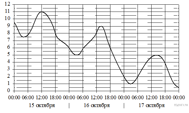 На графике показано изменение температуры воздуха на протяжении трех суток. По горизонтали указывается дата и время, по вертикали значение температуры в градусах Цельсия. Определите по графику наименьшую температуру воздуха 15 октября. Ответ дайте в градусах Цельсия.