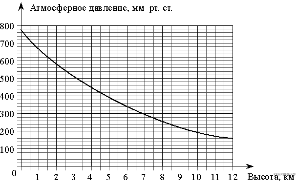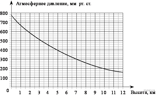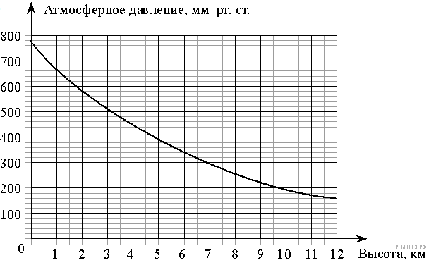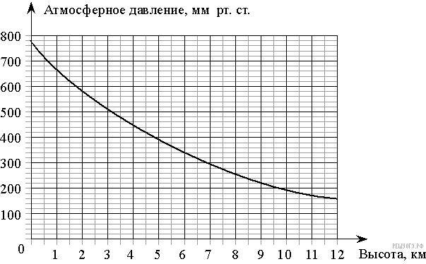 На графике изображена зависимость атмосферного давления от высоты над уровнем моря. На горизонтальной оси отмечена высота над уровнем моря в километрах, на вертикальной — давление в миллиметрах ртутного столба. Определите по графику, на какой высоте атмосферное давление равно 200 миллиметрам ртутного столба. Ответ дайте в километрах.