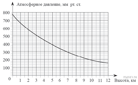 На графике изображена зависимость атмосферного давления (в миллиметрах ртутного столба) от высоты над уровнем моря (в километрах). На какой высоте (в км) летит воздушный шар, если барометр, находящийся в корзине шара, показывает давление 540 миллиметров ртутного столба?