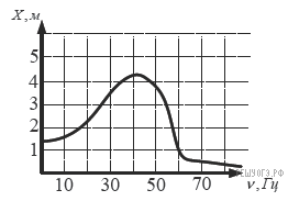 На рисунке изображен график зависимости амплитуды вынужденных колебаний от частоты колебаний. По вертикальной оси откладывается амплитуда (в м), по горизонтальной — частота колебаний (в Гц). По рисунку определите частоту колебаний, если амплитуда была равна 1 м.